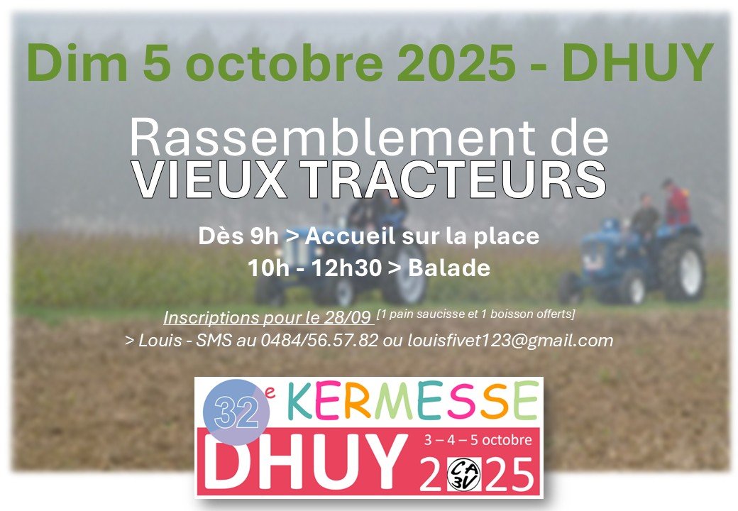 Dim 5 octobre 2025 - DHUYDans le cadre de la 32è kermesse de DhuyRassemblement de VIEUX TRACTEURSDès 9h > Accueil sur la place10h - 12h30 > BaladeInscription pour le 28/09 (1 pain saucisse et 1 boisson offerts)> Louis - SMS au 0484/56.57.82 ou louisfivet123@gmail.com