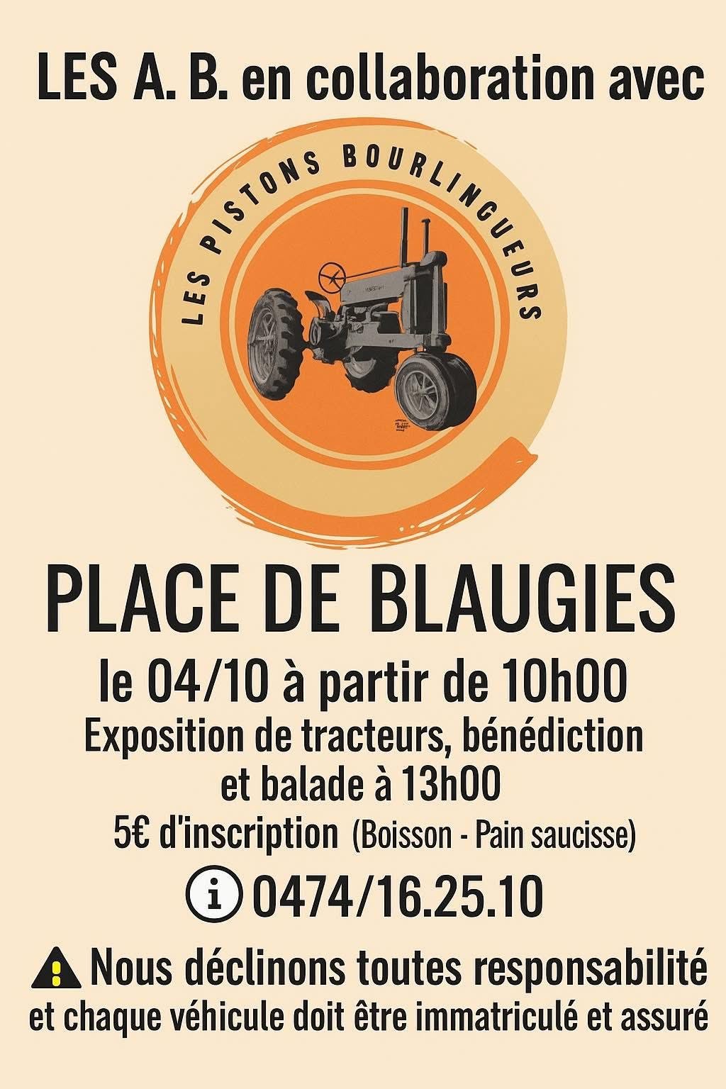 Samedi 04 octobre Dès 10h : Grande brocante (Rue de la Frontière) + exposition de tracteurs (Place de Blaugies) & balade organisée Dès 18h : Bingo avec de jolis lots à gagner Dès 20h : Soirée festive avec le Set de Deejay Teddy – ouvert à tous !